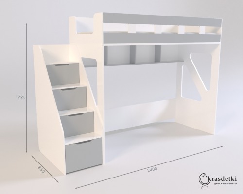 Стильная и красивая кровать-чердак представлена в разных цветовых сочетаниях, а потому позволит обустроить как комнату девочки, так и мальчика. Компактная выдвижная лестница с ящиками, ведущая на второй ярус к спальному месту, бережет пространство комнаты. Также у кровати-чердака имеется выдвижной столик, на котором можно рисовать или даже делать уроки, и ящички для хранения карандашей, альбомов и других мелочей.