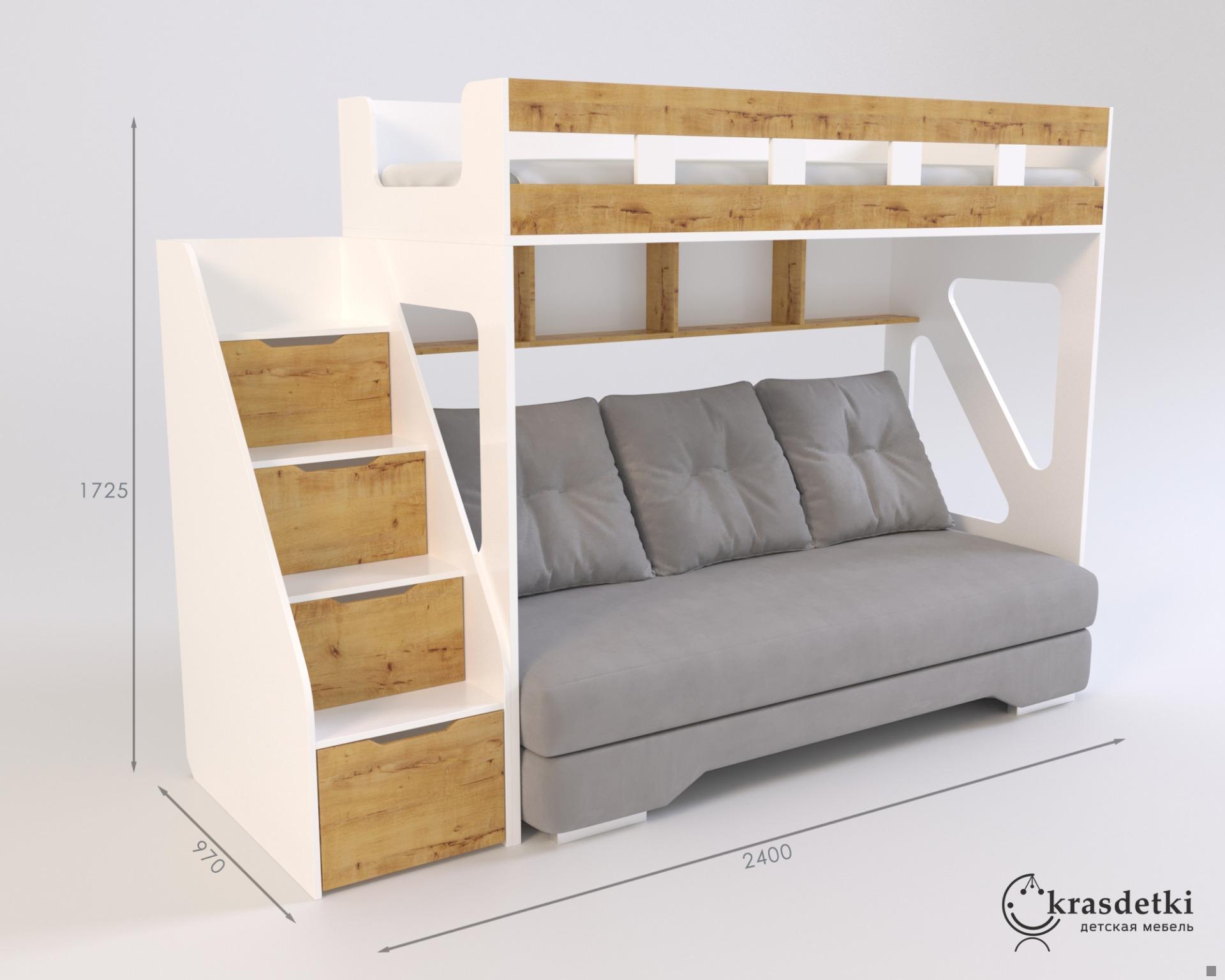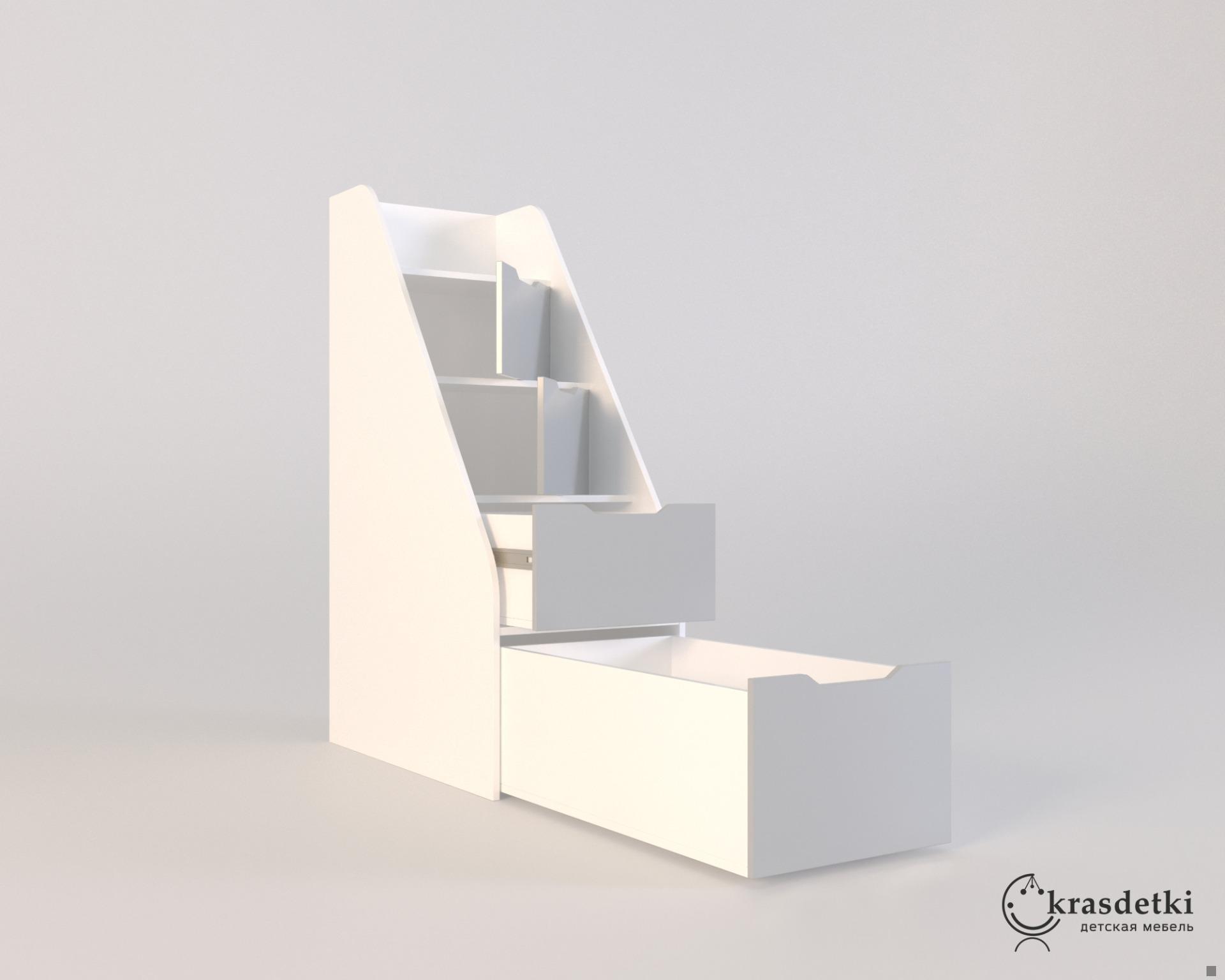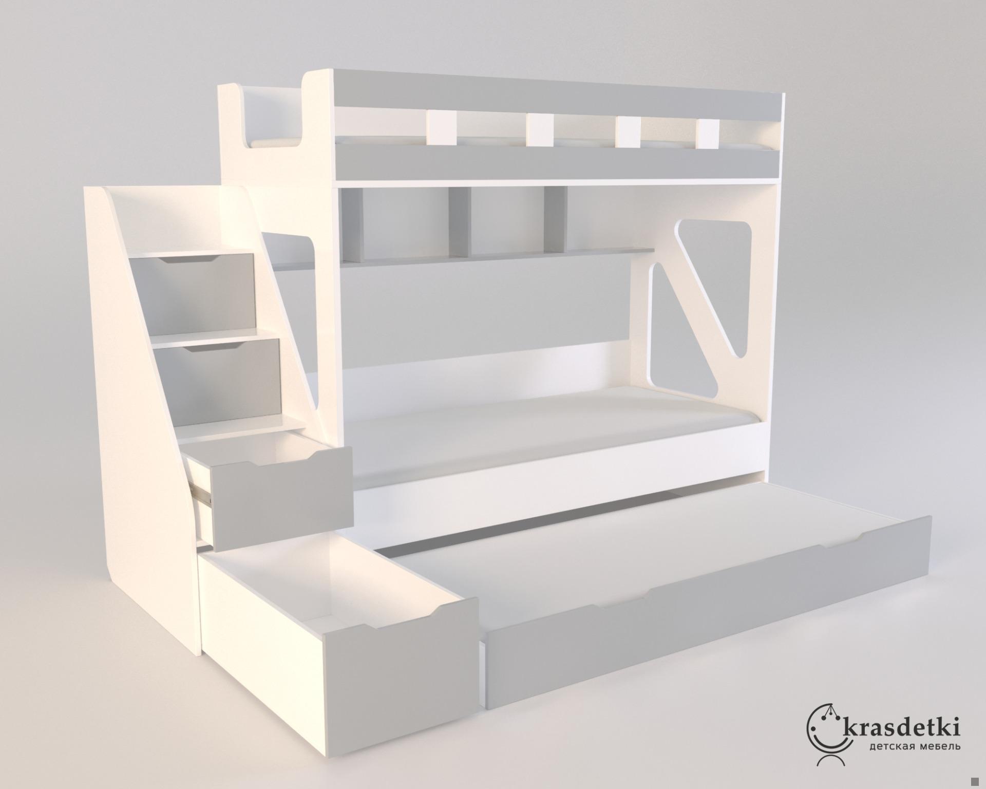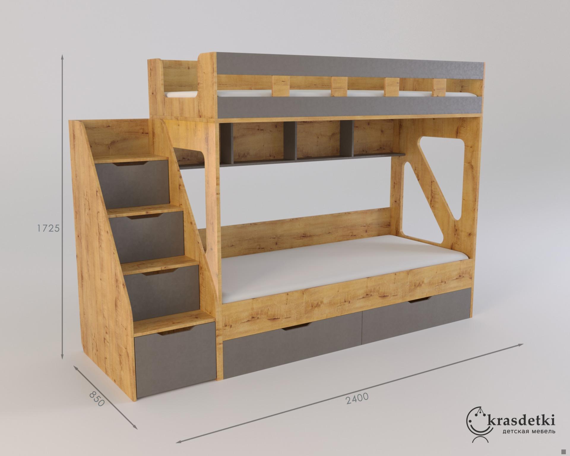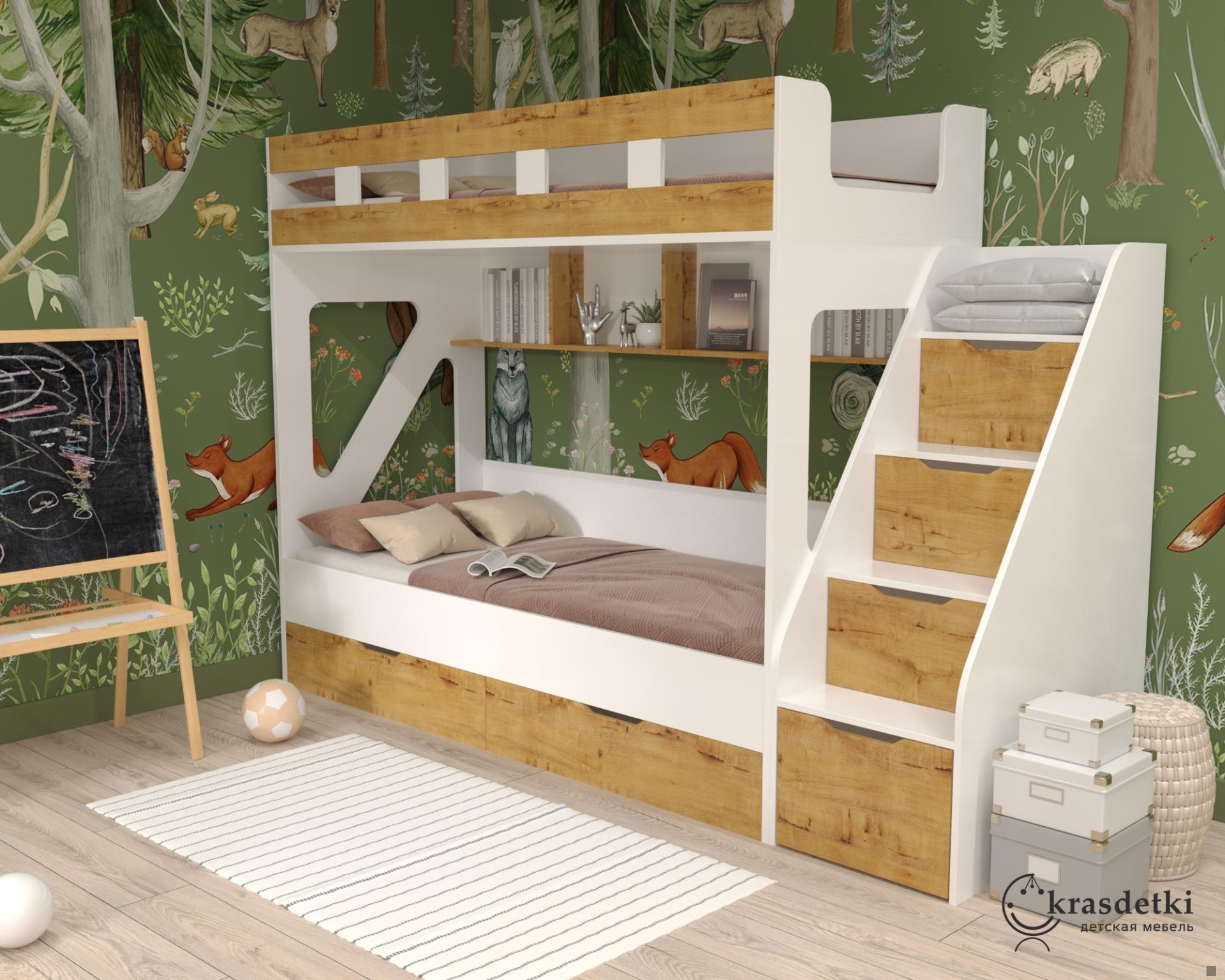 Двухъярусная кровать выполнена из качественных материалов, имеет надежное и прочное основание и крепления. На второй этаж ведет лесенка с металлическими перекладинами, для обеспечения дополнительной безопасности спальное место на втором ярусе огорожено бортиком. Под кроватью предусмотрены выдвижные ящики, в которых можно хранить постельное белье, игрушки или другие вещи.